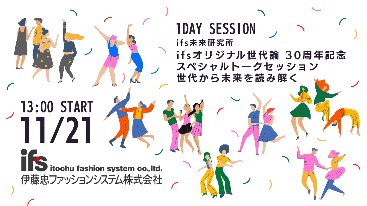 ifs未来研究所 「ifsオリジナル世代論 30周年記念 スペシャルトークセッション 世代から未来を読み解く」 開催決定!伊藤忠ファッションシステム独自の世代区分は1995年に発表されて以来、自社のコンサルティング業務の礎であると同時に、クライアント企業の課題を解決するベースとなる視点として、長年活用されてきました。そんなifs世代論も、誕生から今年で30周年を迎えます。 Knowledge